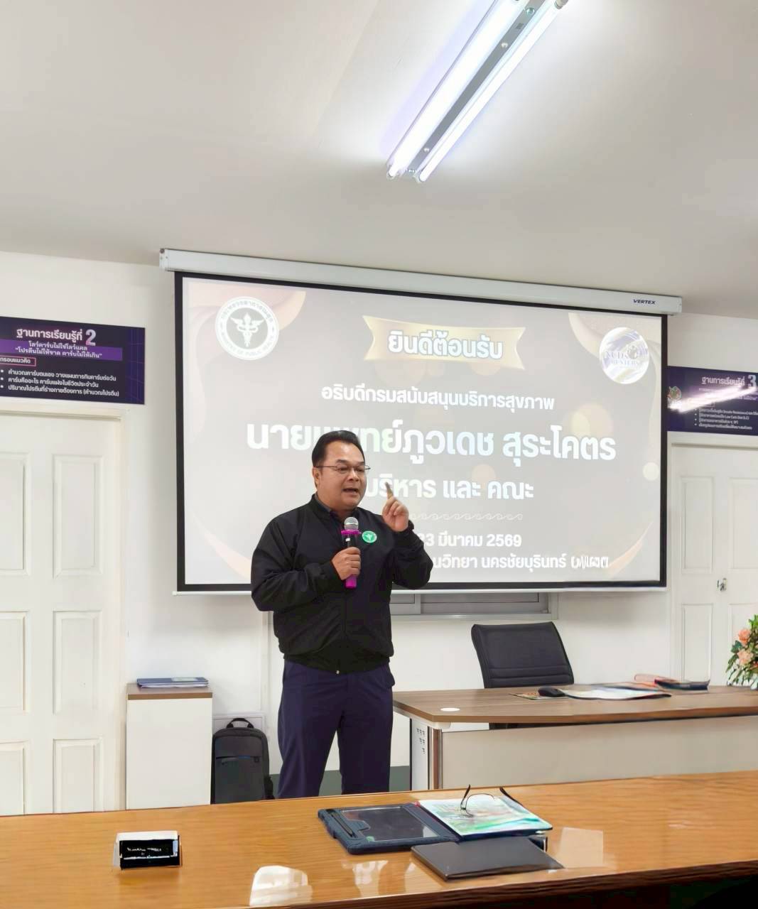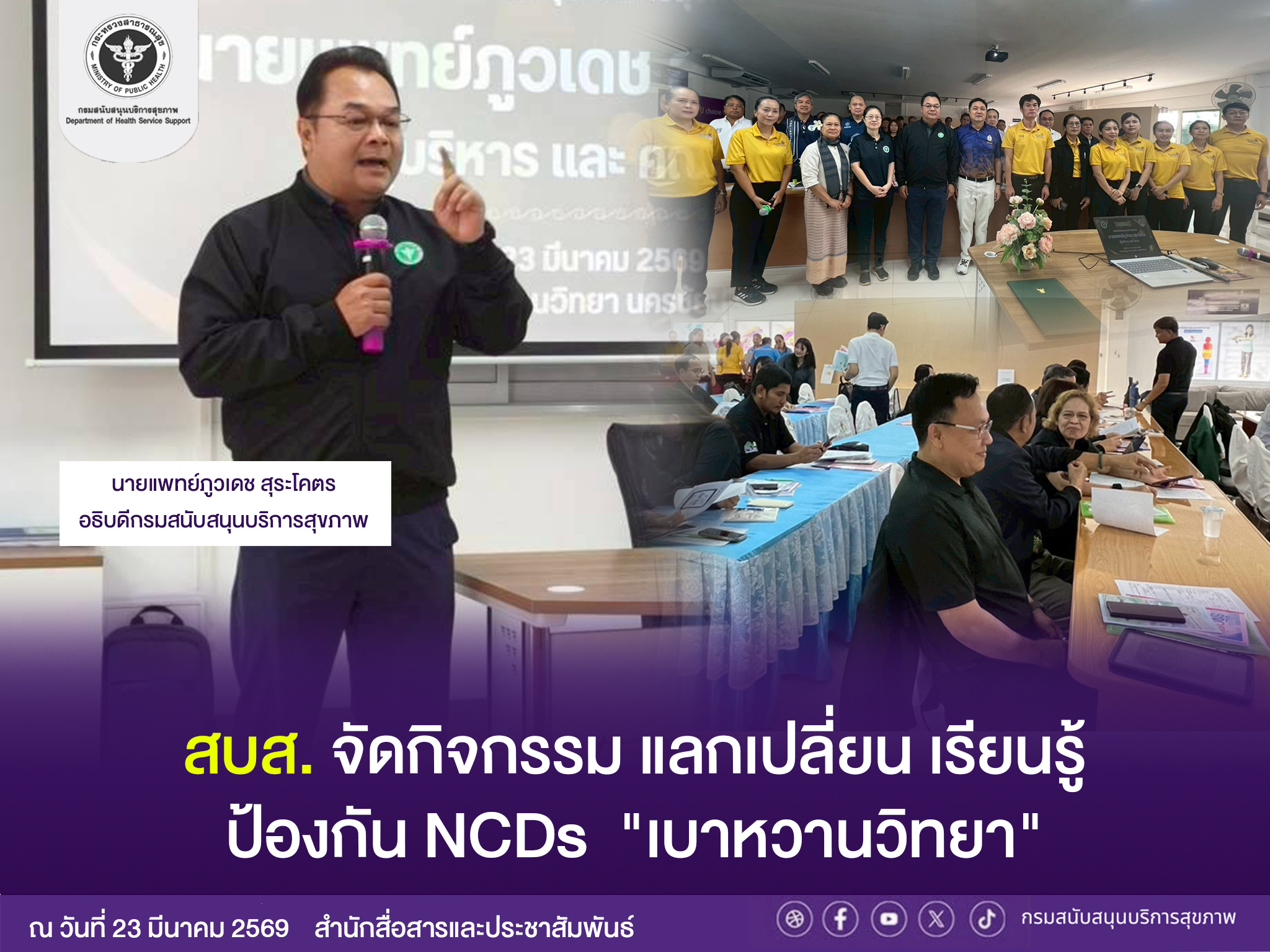 วันนี้ (22 มีนาคม 2569) ณ โรงเรียนเบาหวานวิทยานครชัยบุรินทร์ จังหวัดนครราชสีมา นายแพทย์ภูวเดช สุระโคตร อธิบดีกรมสนับสนุนบริการสุขภาพ (สบส.) กระทรวงสาธารณสุข เป็นประธานเปิดกิจกรรมการเรียนรู้กระบวนการป้องกัน ควบคุมโรค NCDs ในชุมชน ซึ่งจัดขึ้นเพื่อเป็นเวทีแลกเปลี่ยน เรียนรู้ ประสบการณ์ในการป้องกัน ควบคุมโรค NCDs จากโรงเรียนเบาหวานวิทยาฯ ซึ่งถือเป็นต้นแบบในการจัดการสุขภาพผู้ป่วยโรค NCDs ให้กลับมามีสุขภาพที่ดีอยู่ในเกณฑ์มาตรฐาน อันจะนำไปสู่การมีคุณภาพชีวิตที่ดีของประชาชนอย่างยั่งยืน โดยมีบุคลากรจากรม สบส. จากส่วนกลาง/ส่วนภูมิภาค และภาคีเครือข่ายที่เกี่ยวข้องเข้าร่วมฯ ซึ่งจัดขึ้นระหว่างวันที่ 22-23 มีนาคม 2569