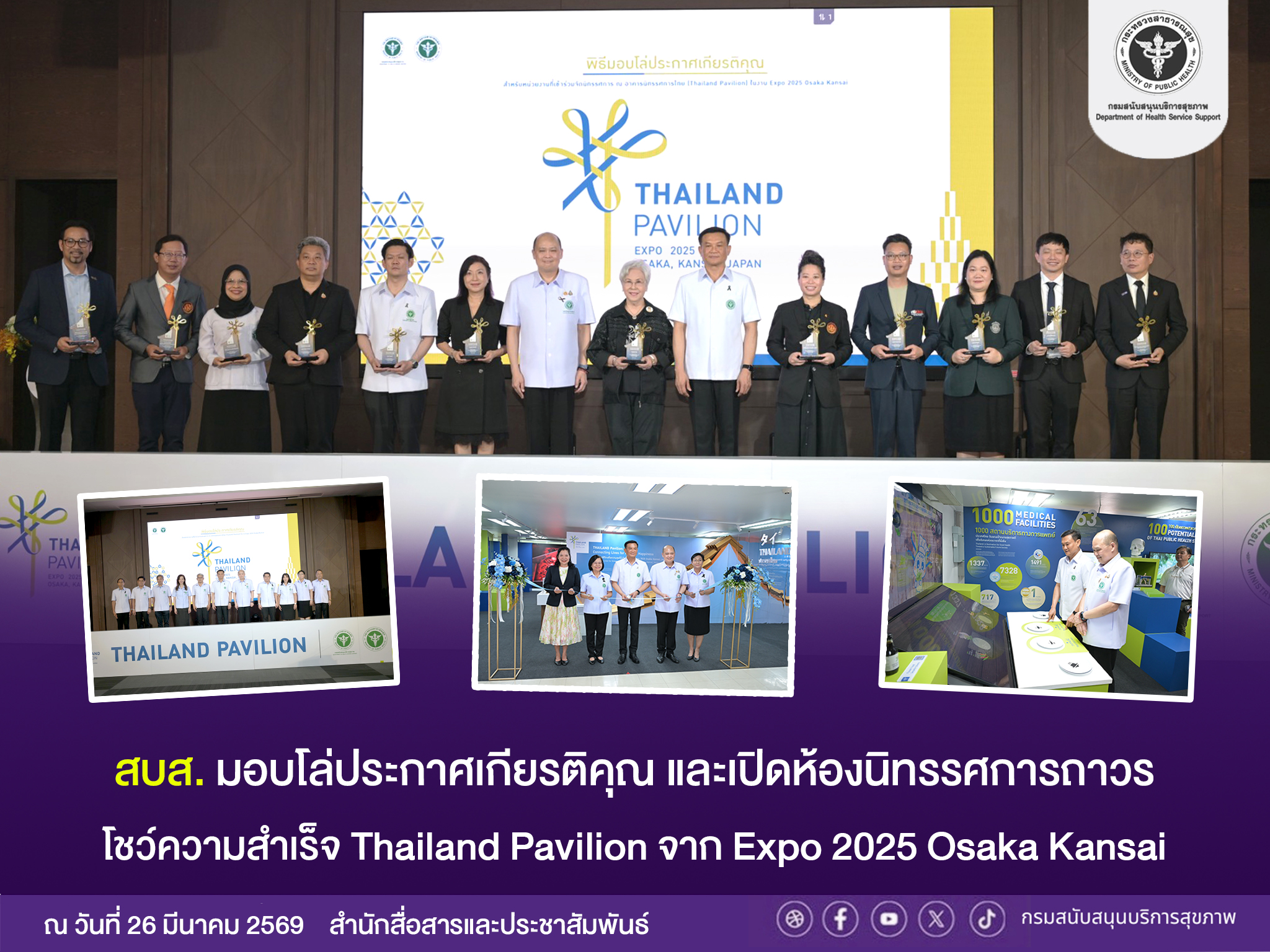 กระทรวงสาธารณสุข โดยกรมสนับสนุนบริการสุขภาพ (สบส.) เปิด “ห้องนิทรรศการถาวร” อาคารนิทรรศการไทย (Thailand Pavilion) ในงาน Expo 2025 Osaka Kansai พร้อมมอบโล่ประกาศเกียรติคุณให้แก่หน่วยงานภาคีเครือข่าย เพื่อบันทึกประวัติศาสตร์ความสำเร็จในการเผยแพร่ศักยภาพด้านการแพทย์ สาธารณสุข และศิลปวัฒนธรรมของไทยสู่สายตาประชาคมโลก วันนี้ (26 มีนาคม 2569) ณ อาคารกรมสนับสนุนบริการสุขภาพ กระทรวงสาธารณสุข จังหวัดนนทบุรี นายแพทย์สุระ วิเศษศักดิ์ ที่ปรึกษากรมสนับสนุนบริการสุขภาพ เป็นประธานในพิธีเปิดห้องแสดงนิทรรศการถาวรเกี่ยวกับอาคารนิทรรศการไทย (Thailand Pavilion) ในงาน Expo 2025 Osaka Kansai พร้อมพิธีมอบโล่ประกาศเกียรติคุณให้แก่หน่วยงานภาคีเครือข่าย 51 หน่วยงาน เพื่อบันทึกประวัติศาสตร์ความสำเร็จในการเผยแพร่ศักยภาพด้านการแพทย์ สาธารณสุข และศิลปวัฒนธรรมของไทยสู่สายตาประชาคมโลก โดยมีนายแพทย์กรกฤช ลิ้มสมมุติ รองอธิบดีกรมสนับสนุนบริการสุขภาพ คณะผู้บริหาร บุคลากรกระทรวงสาธารณสุข และภาคีเครือข่ายที่เกี่ยวข้องทั้งภาครัฐ และเอกชนเข้าร่วม นายแพทย์กรกฤช ลิ้มสมมุติ รองอธิบดีกรมสนับสนุนบริการสุขภาพ เปิดเผยว่าความสำเร็จของประเทศไทยในงาน Expo 2025 Osaka Kansai ณ นครโอซากา ประเทศญี่ปุ่น ตลอดระยะเวลา 184 วันที่ผ่านมา เป็นเครื่องยืนยันถึงศักยภาพที่ไร้ขีดจำกัดของไทยในการเป็นศูนย์กลางการแพทย์และสุขภาพนานาชาติ (Medical and Wellness Hub) การจัดแสดงนิทรรศการภายใต้แนวคิดที่ผสมผสานนวัตกรรมทางการแพทย์เข้ากับภูมิปัญญาและศิลปวัฒนธรรมไทย สามารถดึงดูดผู้เข้าชมได้ถึง 2.1 ล้านคน (2,103,664 คน) ซึ่งถือเป็นความภาคภูมิใจอย่างยิ่งของรัฐบาลไทยและกระทรวงสาธารณสุข “ความสำเร็จในครั้งนี้เกิดจากการบูรณาการความร่วมมืออย่างเข้มแข็งทั้งหน่วยงานภาครัฐและภาคเอกชน การมอบโล่ประกาศเกียรติคุณให้แก่ 51 หน่วยงานในวันนี้ จึงเป็นการขอบคุณและเชิดชูเกียรติพันธมิตรทุกภาคส่วนที่ร่วมกันขับเคลื่อนภาพลักษณ์และเศรษฐกิจสุขภาพของประเทศให้เติบโตอย่างยั่งยืน” ด้านนางสาวกันยารัตน์ กุยสุวรรณ ผู้อำนวยการสำนักส่งเสริมอุตสาหกรรมการแพทย์ครบวงจร กล่าวเพิ่มเติมว่า กรม สบส. ในฐานะหน่วยงานหลักในการดำเนินงาน ได้เล็งเห็นถึงความสำคัญในการส่งต่อองค์ความรู้และบทเรียนความสำเร็จจากเวทีโลก จึงได้จัดทำ “ห้องแสดงนิทรรศการถาวรเกี่ยวกับอาคารนิทรรศการไทยฯ” ขึ้น ณ ชั้น 9 อาคารกรมสนับสนุนบริการสุขภาพ เพื่อให้เป็นแหล่งเรียนรู้ที่มีชีวิตและเป็นต้นแบบการจัดนิทรรศการระดับสากลสำหรับบุคลากรสาธารณสุขและประชาชนทั่วไป โดยห้องนิทรรศการถาวรแห่งนี้จะร