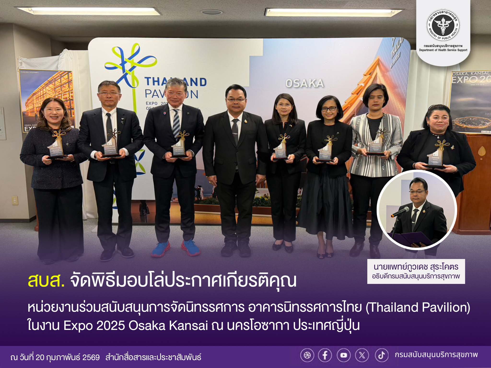 สบส. จัดพิธีมอบโล่ประกาศเกียรติคุณหน่วยงานร่วมสนับสนุนการจัดนิทรรศการ อาคารนิทรรศการไทย (Thailand Pavilion) ในงาน Expo 2025 Osaka Kansai ณ นครโอซากา ประเทศญี่ปุ่น