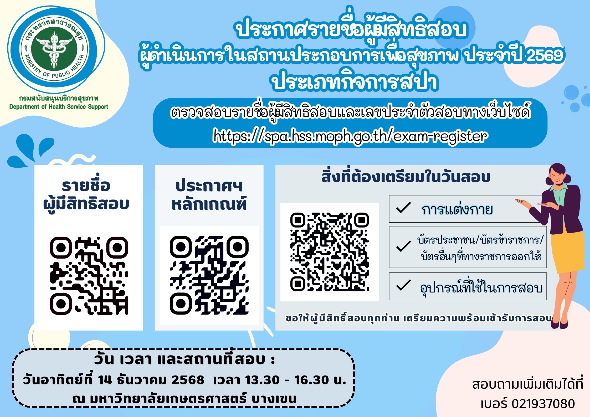 กรมสนับสนุนบริการสุขภาพ ขอแจ้งประกาศ รายชื่อผู้มีสิทธิ์สอบและเลขประจำตัวสอบ สำหรับการสอบผู้ดำเนินการในสถานประกอบการเพื่อสุขภาพ ประเภทกิจการ สปา ประจำปี พ.ศ. 2569 1. การตรวจสอบรายชื่อและเลขประจำตัวสอบ ผู้สมัครสอบสามารถตรวจสอบรายชื่อผู้มีสิทธิ์สอบและเลขประจำตัวสอบได้ที่: https://spa.hss.moph.go.th/exam-register (กรุณาสแกน QR Code ตรวจสอบรายชื่อที่ปรากฏในเอกสารแนบ) 2. กำหนดวัน เวลา และสถานที่สอบ วันสอบ: วันอาทิตย์ที่ 14 ธันวาคม 2568 เวลาสอบ: 13.30 – 16.30 น. สถานที่สอบ: มหาวิทยาลัยเกษตรศาสตร์ บางเขน 3. สิ่งที่ผู้มีสิทธิ์สอบต้องเตรียมในวันสอบ โปรดเตรียมพร้อมตามรายการดังต่อไปนี้: ✅ การแต่งกาย: แต่งกายสุภาพเรียบร้อย ✅ เอกสารหลักฐาน: บัตรประจำตัวประชาชน หรือ บัตรข้าราชการ หรือ บัตรอื่น ๆ ที่ทางราชการออกให้ ✅ อุปกรณ์: อุปกรณ์ที่ใช้ในการสอบ (ตามประกาศหลักเกณฑ์) ข้อควรทราบ: ผู้เข้าสอบต้องเดินทางถึงสถานที่สอบก่อนเวลาที่กำหนด และปฏิบัติตามกฎระเบียบการเข้าห้องสอบอย่างเคร่งครัด สอบถามเพิ่มเติม: กรุณาติดต่อ เบอร์โทรศัพท์ 021937080