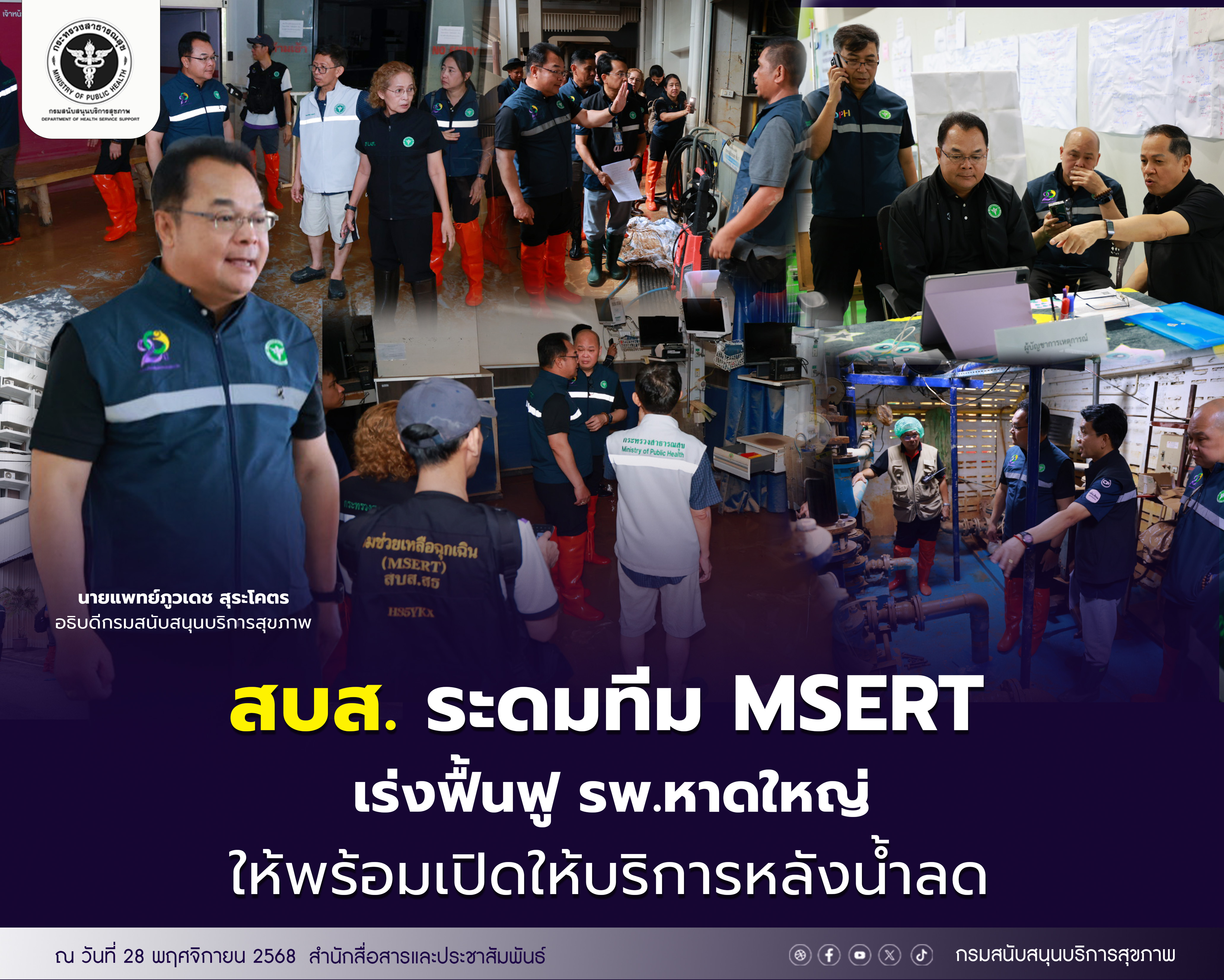 วันที่ 28 พฤศจิกายน 2568 นายพัฒนา พร้อมพัฒน์ รัฐมนตรีว่าการกระทรวงสาธารณสุข (รมว.สธ.) ได้สั่งการให้กรมสนับสนุนบริการสุขภาพ (สบส.) โดยนายแพทย์ภูวเดช สุระโคตร อธิบดีกรมสนับสนุนบริการสุขภาพ นายแพทย์กรกฤช ลิ้มสมมุติ รองอธิบดีกรม สบส. พร้อมด้วยนายอดุลย์ ขมิ้นเขียว ผู้อำนวยการกองวิศวกรรมการแพทย์ นางศศิจริญญา อำม์พรพันธ์ ผู้อำนวยการศูนย์สนับสนุนบริการสุขภาพที่ 12 นำทีมปฏิบัติการสนับสนุนระบบบริการสุขภาพในภาวะฉุกเฉิน หรือ ทีมเอ็มเสิร์ท (Medical Supportive Emergency Response Team : MSERT) ลงพื้นที่จังหวัดสงขลาเพื่อดำเนินการตามข้อสั่งการ ภารกิจเริ่มต้นด้วยการให้กำลังใจและมอบชุดสนับสนุนการปฏิบัติงานแก่อาสาสมัครสาธารณสุขประจำหมู่บ้าน (อสม.) ในพื้นที่ จากนั้น ทีม MSERT ได้เดินทางเข้าเยี่ยมโรงพยาบาลสนาม สนามบินนานาชาติหาดใหญ่ และลงพื้นที่สำรวจความเสียหายอย่างละเอียด ณ โรงพยาบาลหาดใหญ่ การสำรวจครั้งนี้มีวัตถุประสงค์เพื่อสรุปข้อมูลความเสียหายทั้งหมด และวางแผนการฟื้นฟูระบบบริการทางการแพทย์และสาธารณูปโภคที่ได้รับผลกระทบจากน้ำท่วมอย่างเป็นระบบ โดยมุ่งเน้นให้โรงพยาบาลหาดใหญ่สามารถกลับมาเปิดให้บริการดูแลสุขภาพพี่น้องประชาชนได้อย่างเต็มที่โดยเร็วที่สุด