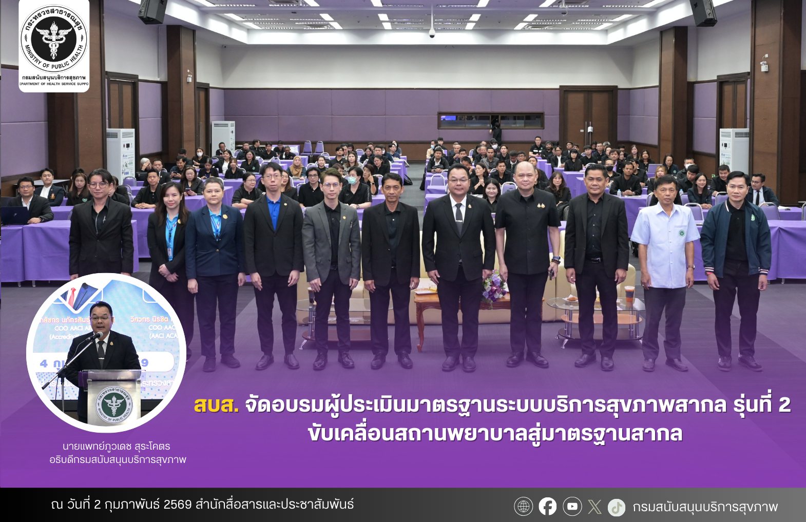 วันนี้ (2 กุมภาพันธ์ 2569) ณ อาคารกรมสนับสนุนบริการสุขภาพ (สบส.) กระทรวงสาธารณสุข จังหวัดนนทบุรี นายแพทย์ภูวเดช สุระโคตร อธิบดีกรมสนับสนุนบริการสุขภาพ เป็นประธานเปิดการอบรมผู้เยี่ยมสำรวจและประเมินผลมาตรฐานระบบบริการสุขภาพตามมาตรฐานการเยี่ยมสำรวจแบบสากล (Surveyor International) รุ่นที่ 2 ซึ่งจัดขึ้นในระหว่างวันที่ 2 - 4 กุมภาพันธ์ 2569 เพื่อสื่อสาร สร้างความเข้าใจ การฝึกปฏิบัติเทคนิค การตรวจเยี่ยมสำรวจ ติดตามและประเมินผล ตามมาตรฐานการเยี่ยมสำรวจแบบสากล ซึ่งจะช่วยให้ผู้เข้ารับการอบรมสามารถนำความรู้ที่ได้ไปพัฒนาและยกระดับคุณภาพบริการของสถานพยาบาล ในสังกัดและนอกสังกัดกระทรวงสาธารณสุข ในการยกระดับสถานพยาบาลสู่มาตรฐานสากล
