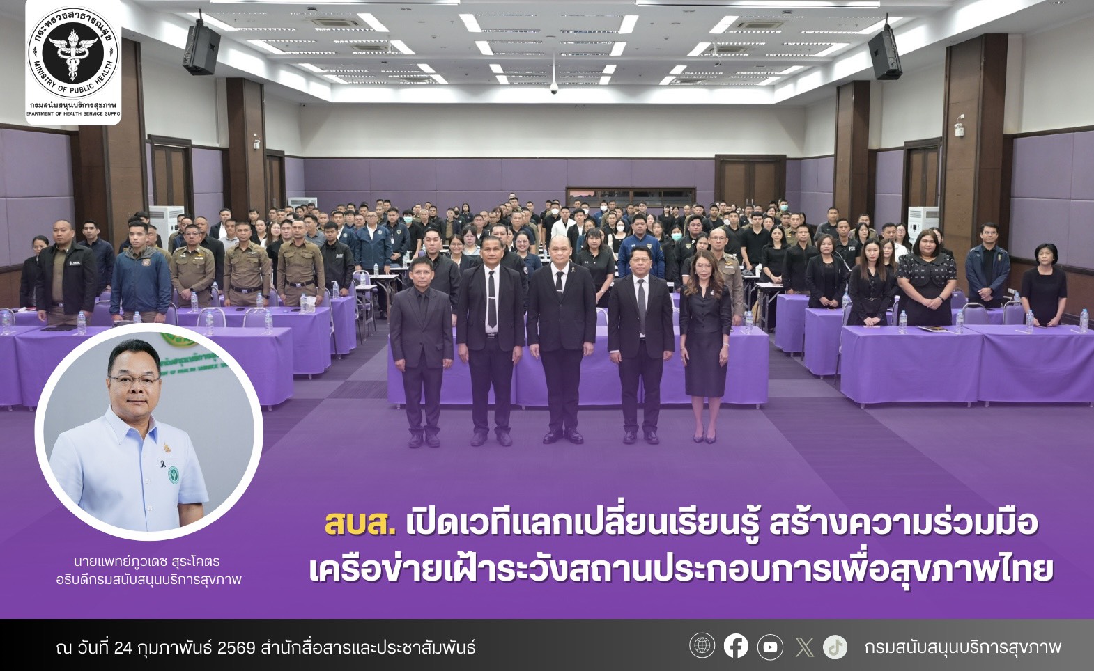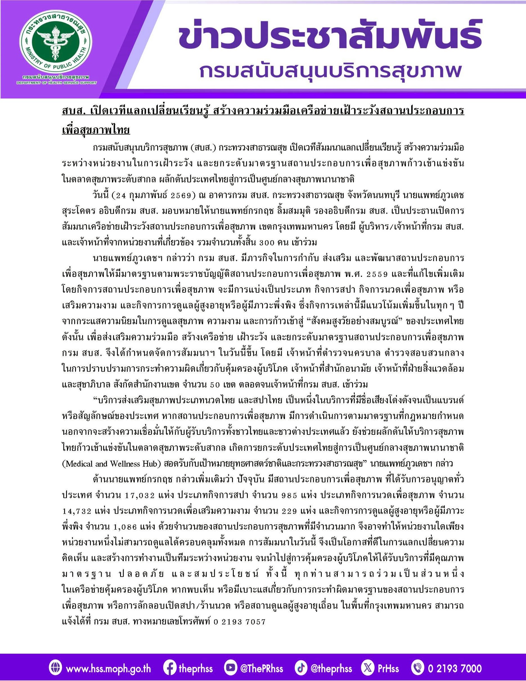 สบส. เปิดเวทีแลกเปลี่ยนเรียนรู้ สร้างความร่วมมือเครือข่ายเฝ้าระวังสถานประกอบการเพื่อสุขภาพไทย กรมสนับสนุนบริการสุขภาพ (สบส.) กระทรวงสาธารณสุข เปิดเวทีสัมมนาแลกเปลี่ยนเรียนรู้ สร้างความร่วมมือระหว่างหน่วยงานในการเฝ้าระวัง และยกระดับมาตรฐานสถานประกอบการเพื่อสุขภาพก้าวเข้าแข่งขันในตลาดสุขภาพระดับสากล ผลักดันประเทศไทยสู่การเป็นศูนย์กลางสุขภาพนานาชาติ วันนี้ (24 กุมภาพันธ์ 2569) ณ อาคารกรม สบส. กระทรวงสาธารณสุข จังหวัดนนทบุรี นายแพทย์ภูวเดช สุระโคตร อธิบดีกรม สบส. มอบหมายให้นายแพทย์กรกฤช ลิ้มสมมุติ รองอธิบดีกรม สบส. เป็นประธานเปิดการสัมมนาเครือข่ายเฝ้าระวังสถานประกอบการเพื่อสุขภาพ เขตกรุงเทพมหานคร โดยมี ผู้บริหาร/เจ้าหน้าที่กรม สบส. และเจ้าหน้าที่จากหน่วยงานที่เกี่ยวข้อง รวมจำนวนทั้งสิ้น 300 คน เข้าร่วม นายแพทย์ภูวเดชฯ กล่าวว่า กรม สบส. มีภารกิจในการกำกับ ส่งเสริม และพัฒนาสถานประกอบการเพื่อสุขภาพให้มีมาตรฐานตามพระราชบัญญัติสถานประกอบการเพื่อสุขภาพ พ.ศ. 2559 และที่แก้ไขเพิ่มเติมโดยกิจการสถานประกอบการเพื่อสุขภาพ จะมีการแบ่งเป็นประเภท กิจการสปา กิจการนวดเพื่อสุขภาพ หรือเสริมความงาม และกิจการการดูแลผู้สูงอายุหรือผู้มีภาวะพึ่งพิง ซึ่งกิจการเหล่านี้มีแนวโน้มเพิ่มขึ้นในทุกๆ ปี จากกระแสความนิยมในการดูแลสุขภาพ ความงาม และการก้าวเข้าสู่ “สังคมสูงวัยอย่างสมบูรณ์” ของประเทศไทย ดังนั้น เพื่อส่งเสริมความร่วมมือ สร้างเครือข่าย เฝ้าระวัง และยกระดับมาตรฐานสถานประกอบการเพื่อสุขภาพกรม สบส. จึงได้กำหนดจัดการสัมมนาฯ ในวันนี้ขึ้น โดยมี เจ้าหน้าที่ตำรวจนครบาล ตำรวจสอบสวนกลางในการปราบปรามการกระทำความผิดเกี่ยวกับคุ้มครองผู้บริโภค เจ้าหน้าที่สำนักอนามัย เจ้าหน้าที่ฝ่ายสิ่งแวดล้อมและสุขาภิบาล สังกัดสำนักงานเขต จำนวน 50 เขต ตลอดจนเจ้าหน้าที่กรม สบส. เข้าร่วม “บริการส่งเสริมสุขภาพประเภทนวดไทย และสปาไทย เป็นหนึ่งในบริการที่มีชื่อเสียงโด่งดังจนเป็นแบรนด์หรือสัญลักษณ์ของประเทศ หากสถานประกอบการเพื่อสุขภาพ มีการดำเนินการตามมาตรฐานที่กฎหมายกำหนด นอกจากจะสร้างความเชื่อมั่นให้กับผู้รับบริการทั้งชาวไทยและชาวต่างประเทศแล้ว ยังช่วยผลักดันให้บริการสุขภาพไทยก้าวเข้าแข่งขันในตลาดสุขภาพระดับสากล เกิดการยกระดับประเทศไทยสู่การเป็นศูนย์กลางสุขภาพนานาชาติ (Medical and Wellness Hub) สอดรับกับเป้าหมายยุทธศาสตร์ชาติและกระทรวงสาธารณสุข” นายแพทย์ภูวเดชฯ กล่าว ด้านนายแพทย์กรกฤช กล่าวเพิ่มเติมว่า ปัจจุบัน มีสถานประกอบการเพ