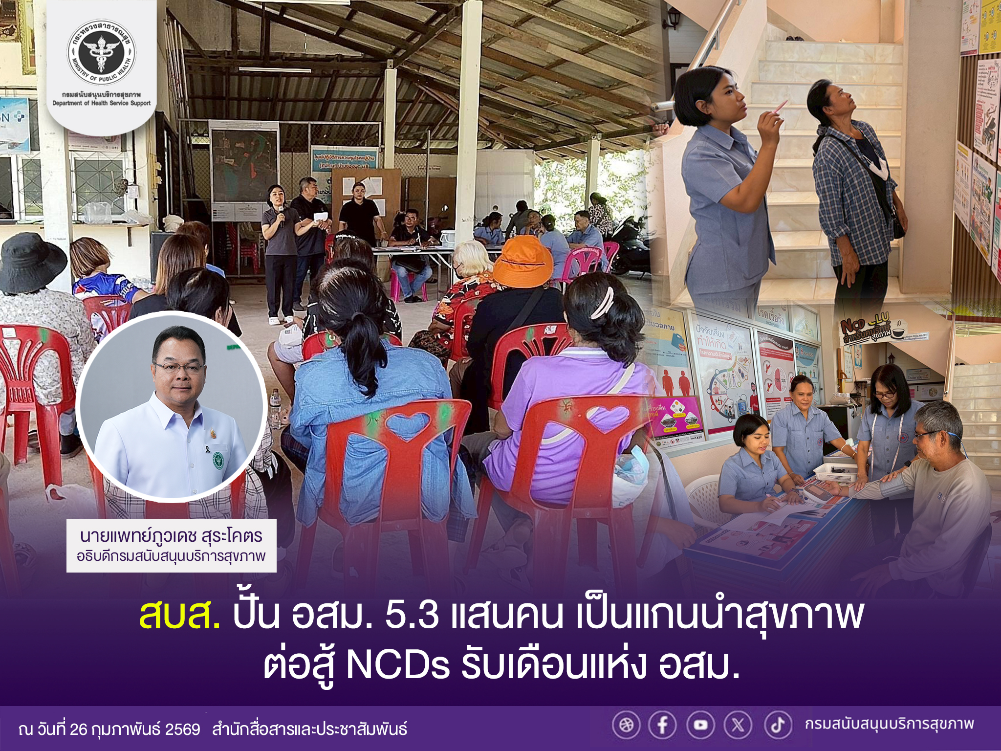 กรมสนับสนุนบริการสุขภาพ (สบส.) กระทรวงสาธารณสุข ปั้นอาสาสมัครสาธารณสุขประจำหมู่บ้าน (อสม.) กว่า 5.3 แสนคน ร่วมเป็นแกนนำสุขภาพ ต่อสู้โรคไม่ติดต่อเรื้อรัง (NCDs) สร้างความเป็นอยู่ที่ดีในทุกช่วงวัยอย่างยั่งยืน รับเดือนแห่ง อสม. นายแพทย์ภูวเดช สุระโคตร อธิบดีกรม สบส. ให้สัมภาษณ์ว่า ตามที่องค์กรสหประชาชาติ ได้กำหนดเป้าหมายการพัฒนาที่ยั่งยืน (Sustainable Development Goals: SDGs) โดยอาศัยการวางแผนการพัฒนาระดับชาติและประชาชนทุกคนให้ความร่วมมือ เพื่อที่จะบรรลุเป้าหมายที่ต้องการยุติความยากจนและสร้างสังคมให้มีความเป็นอยู่ที่ดี โดยมีทั้งสิ้น 17 เป้าหมาย ซึ่งเป้าหมายที่ 3 ที่ว่าด้วยการสร้างหลักประกันการมีสุขภาวะที่ดี และส่งเสริมความเป็นอยู่ที่ดีสำหรับทุกคนในทุกช่วงวัย ได้กำหนดเป้าหมายย่อย ในการลดอัตราการเสียชีวิตจาก NCDs ก่อนวัยอันควรลง 1 ใน 3 ภายในปี พ.ศ. 2573 ดังนั้น เพื่อสร้างระบบสุขภาพที่มีความเข้มแข็ง และยั่งยืนสอดรับกับเป้าหมายการพัฒนาฯ และยุทธศาสตร์ชาติ กระทรวงสาธารณสุข โดยกรม สบส. จึงได้วางแนวทางการดำเนินงานและพัฒนาศักยภาพ อสม. จัดกิจกรรมสาธารณสุขมูลฐาน เพื่อเสริมสร้างความเข้มแข็ง ให้ อสม.ทั่วประเทศ เป็นแกนนำสุขภาพในการต่อสู้กับ NCDs ชุมชนสามารถดูแลสุขภาพตนเองได้ โดยตั้งเป้าพัฒนา อสม. อย่างน้อยครึ่งหนึ่ง หรือประมาณ 5 แสนคน (537,582 คน) ให้มีศักยภาพในการจัดการสุขภาพชุมชน ภายในกุมภาพันธ์ 2569 ซึ่งในเดือนมีนาคมที่จะถึงนี้ถือเป็นเดือนที่มีความสำคัญต่อพี่น้อง อสม. ด้วยวันที่ 20 มีนาคมของทุกปี เป็นวันอาสาสมัครสาธารณสุขแห่งชาติ โดยในปีนี้ กรม สบส. กำหนดจัดงานวันอาสาสมัครสาธารณสุขแห่งชาติ ประจำปี พ.ศ. 2569 ในวันที่ 19-20 มีนาคม 2569 ณ โรงแรม เอเชีย แอร์พอร์ท จังหวัดปทุมธานี เพื่อเชิดชูเกียรติ และตอบแทนพี่น้อง อสม. ที่เข้ามาร่วมดูแลสุขภาพประชาชนอย่างยาวนาน ด้านนายแพทย์กรกฤช สิ้มสมมุติ รองอธิบดีกรม สบส. กล่าวเพิ่มเติมว่า สำหรับการดำเนินงานของ อสม. แกนนำสุขภาพนั้น อสม. จะมีบทบาทหน้าที่ “2 1” โดยมีบทบาทพื้นฐาน 2 บทบาท ที่ต้องดำเนินการ ได้แก่ 1. คัดกรองโรคไม่ติดต่อเรื้องรัง (NCDs) ในประชาชนอายุ 35 ปีขึ้นไป 2.ให้คำแนะนำการปรับเปลี่ยนพฤติกรรมสุขภาพ และเลือกทำบทบาทเพิ่มเติมอย่างน้อย 1 จาก 3 บทบาท ตามบริบทของพื้นที่ ได้แก่ 1. สร้างอาสาสมัครประจำครอบครัว (อสค.) 2. ติดตามเยี่ยมบ้านร่วมกับเจ้าหน้าที่ และ 3. ร่วมกิจกรรมแก้ไขปัญหา NCDs ในชุมชน จึงจะถือว่าเป็น อสม. ที่มีศักยภาพในการจัดการสุขภาพชุมชน ซึ่งหลังจากเดือนมีนาคม 2569 จะมีการต่อยอดพัฒนา อสม. ให้ครบร้อยละ 98 (ประมาณ 1.05 ล้านคน) ภายใน